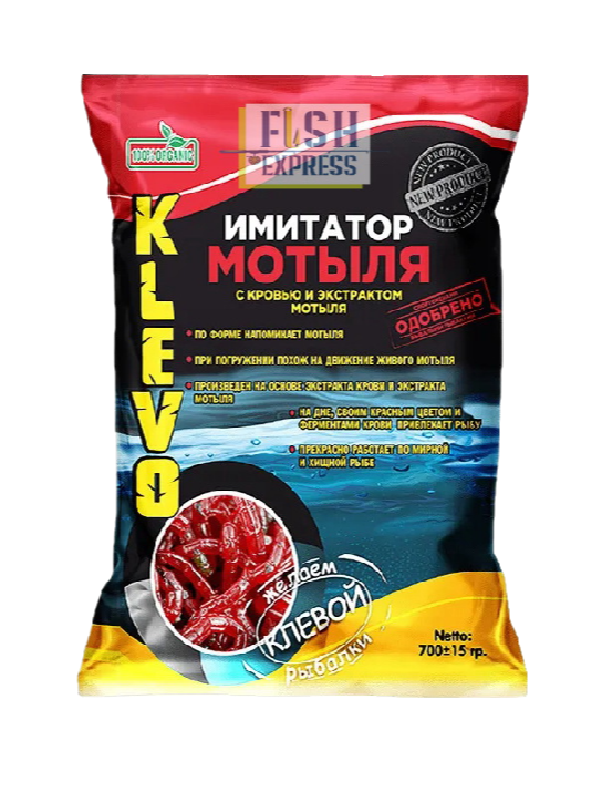 Продукт имитирует личинку мотыля, не только формой и цветом, но и поведением в воде (при погружении в воду продукт в точности повторяет движения личинки вплоть до достижения дна). Кроме этого имитатор мотыля имеет характерный аромат, который так нравится рыбе. Привклекает внимание своим красным цветом.